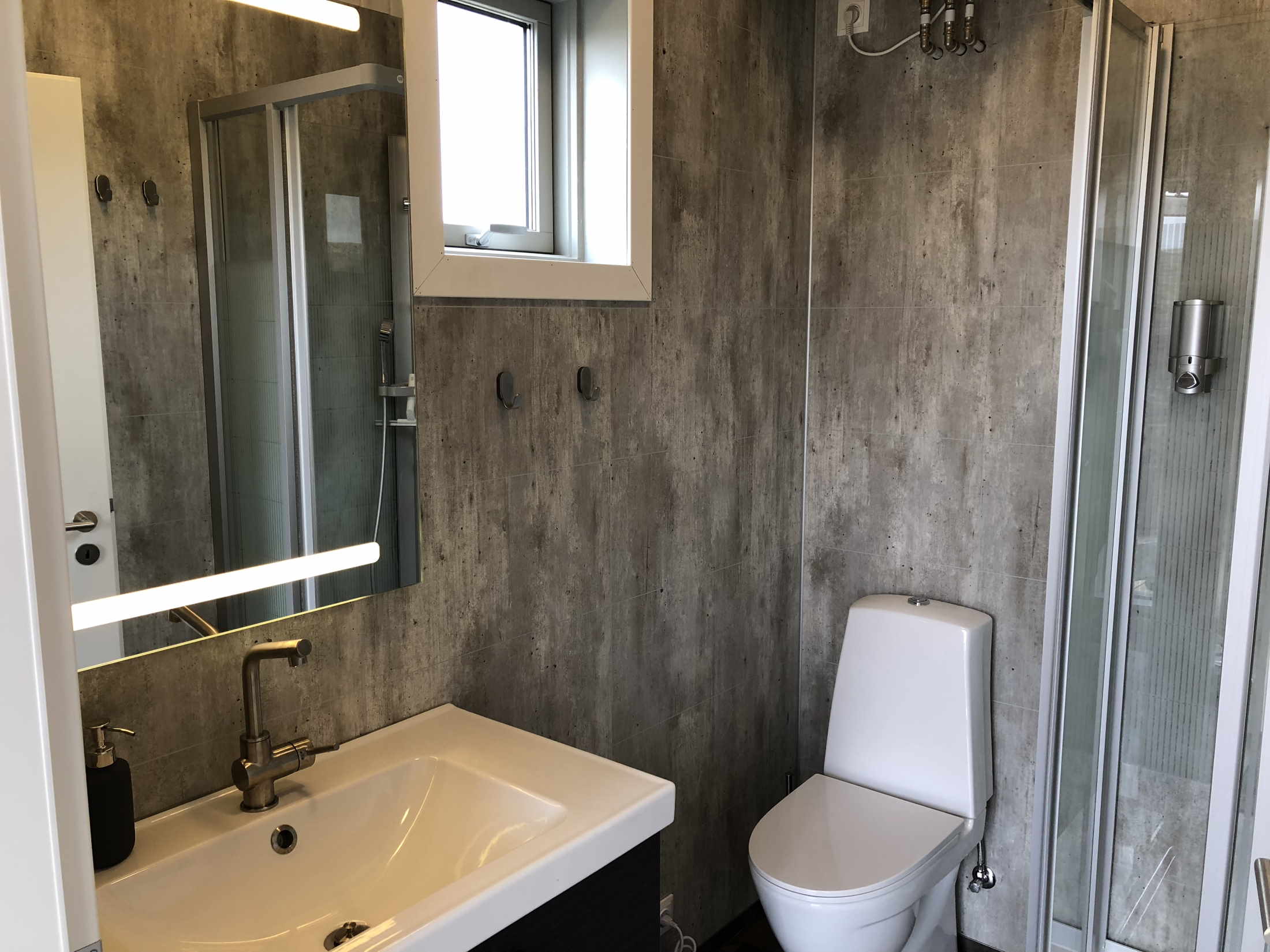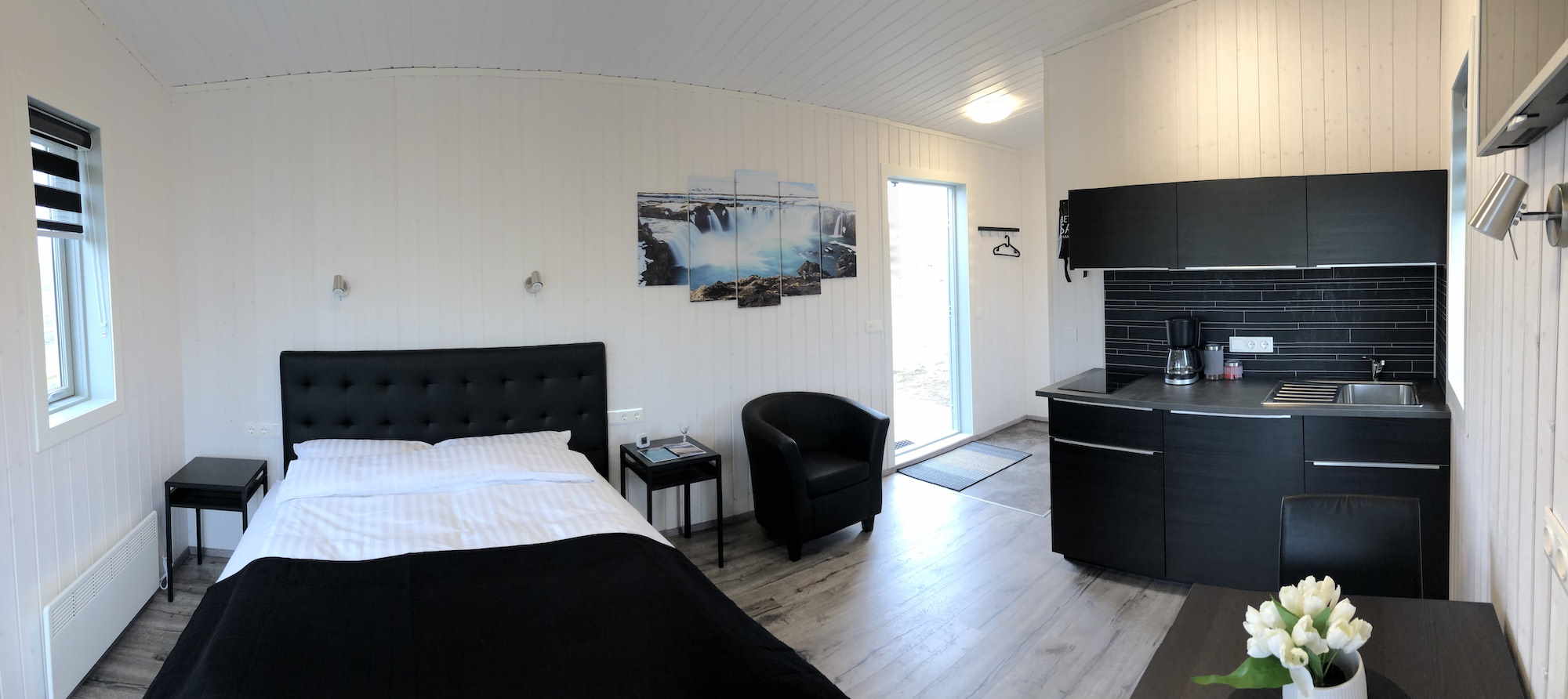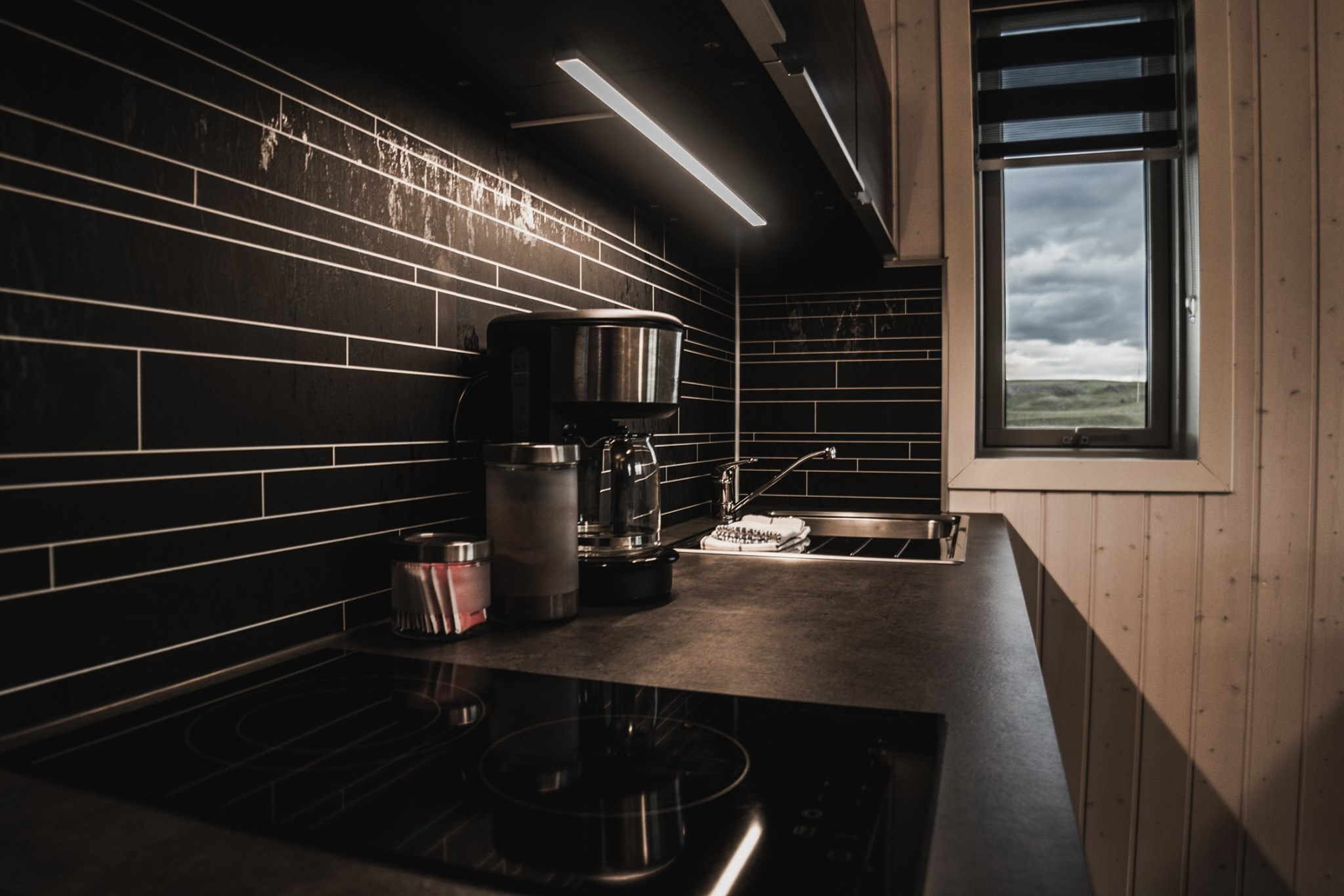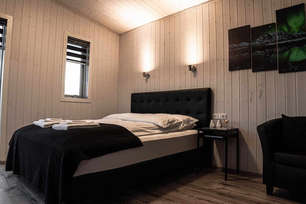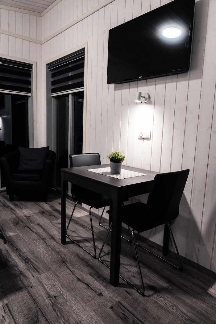Queen size bed for two people, 32″ (nr. 1-3) or 43″ (nr. 4-6) TV on the wall to watch Netflix or the local TV channel (RÚV). Free Wi-Fi. Duvets and duvet covers will be ready along with a sheet on the bed. Two cozy armchairs for chat and chilling. The dining table can be upsized (doubled) if you have friends staying in the other cottages to have meal with you or just a chat over a cup of coffee.