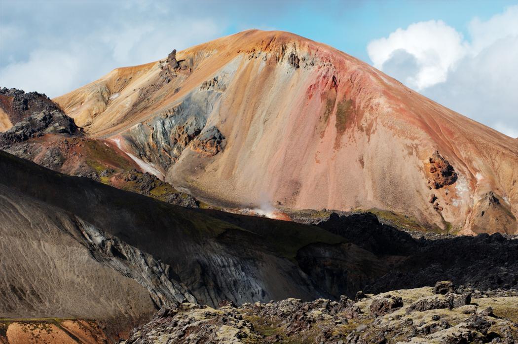 The name means in English: sulphur wave. It comes from the sulphur spots which have coloured its sides. But there are other colours, too: green from mosses, black and blue from lava and ashes, red from iron in the earth. It could very well be the most colourful mountain of Iceland and so its picture is often found in books and calendars.