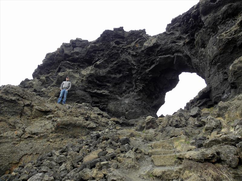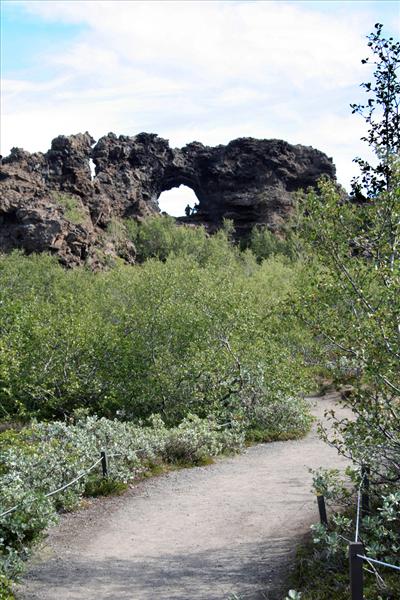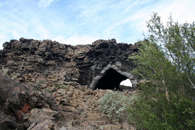 The Dimmuborgir area consist of a massive, collapsed lava tube formed by a lava lake flowing in from a large eruption in the Þrengslaborgir and Lúdentsborgir crater row to the East, about 2300 years ago. At Dimmuborgir, the lava pooled over a small lake. As the lava flowed across the wet sod, the water of the marsh started to boil, the vapour rising through the lava forming lava pillars from drainpipe size up to several meters in diameter. As the lava continued flowing towards lower ground in the Mývatn area, the top crust collapsed, but the hollow pillars of solidified lava remained. The lava lake must have been at least 10 meters deep, as estimated by the tallest structures still standing.