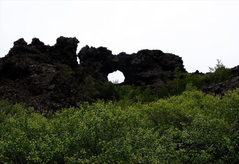 Dimmuborgir is a large area of unusually shaped lava fields east of Mývatn in Iceland. The Dimmuborgir area is composed of various volcanic caves and rock formations, reminiscent of an ancient collapsed citadel (hence the name). The dramatic structures are one of Iceland's most popular natural tourist attractions.