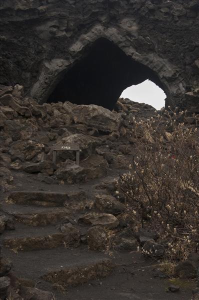 The lava flow surface remains partly intact around the Dimmuborgir area, so that the Dimmuborgir itself sits below the surrounding surface area. The area is characterised by large hollow cell- or chamber-like structures formed around bubbles of vapour, and some dramatically standing lava pillars. Several of the chambers and pillar bases are large enough to house humans, giving rise to the term "castles" (borgir).