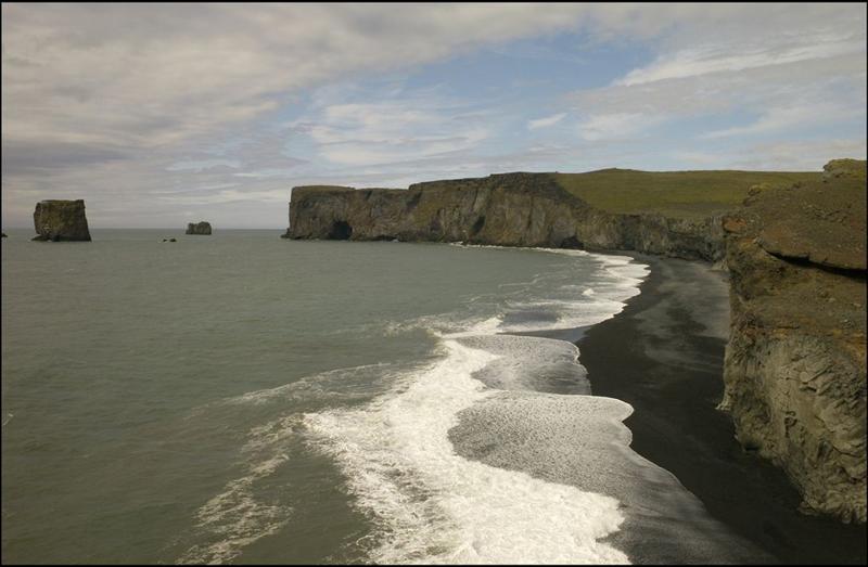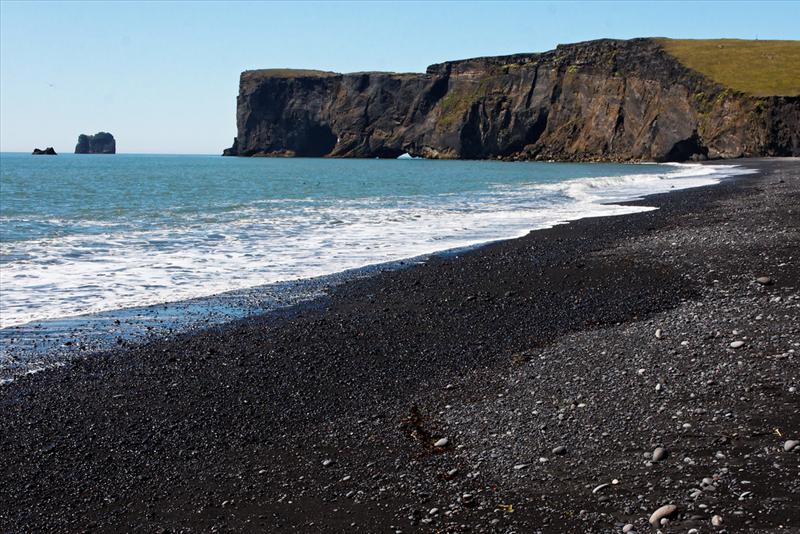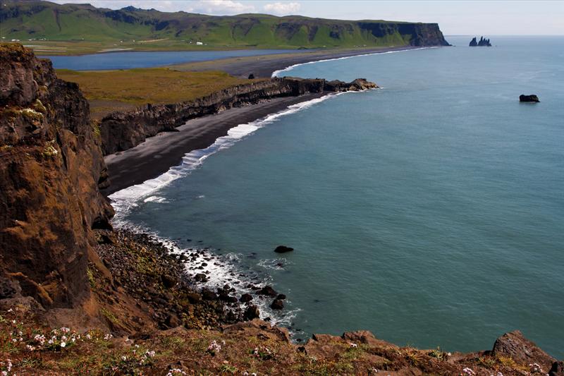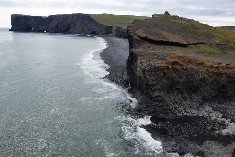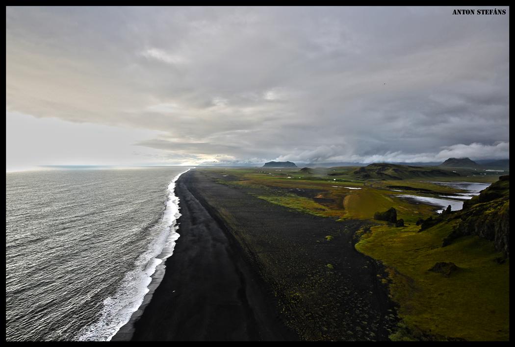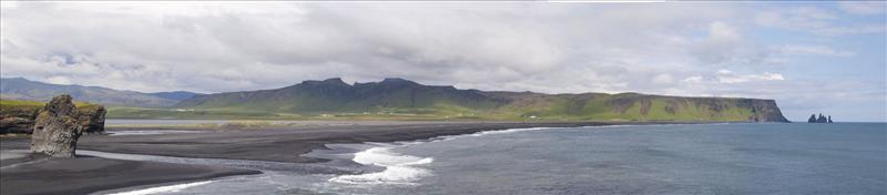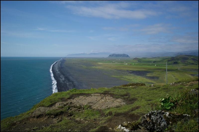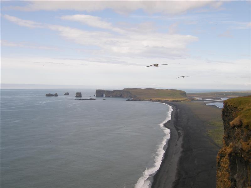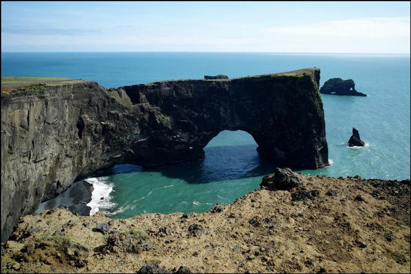 The view from Dyrhólaey is interesting: To the north is to be seen the big glacier Mýrdalsjökull. To the east, the black lava columns of the Reynisdrangar come out of the sea, and to the west the whole coastline in the direction of Selfoss is visible - depending on weather conditions. In front of the peninsula, there is a gigantic black arch of lava standing in the sea, which gave the peninsula its name (meaning: the hill-island with the door-hole).