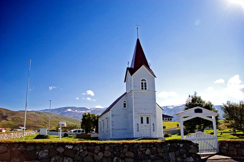 Kirkjan stendur í sjávarþorpi.