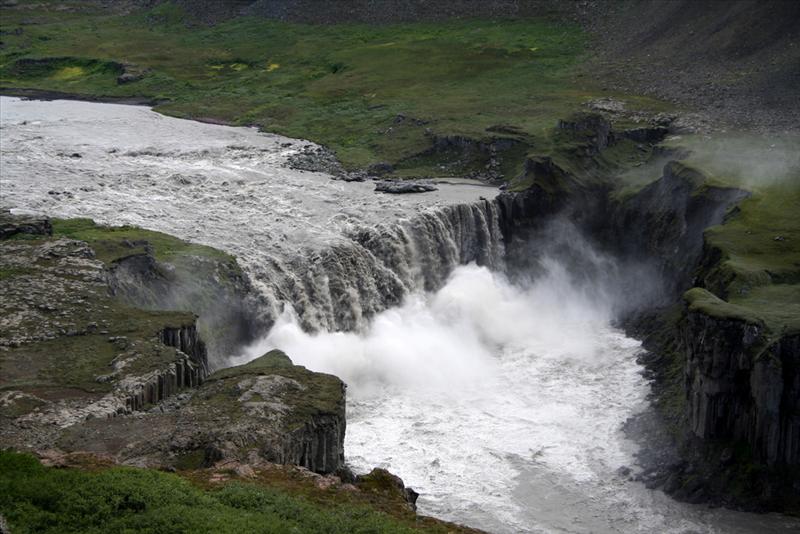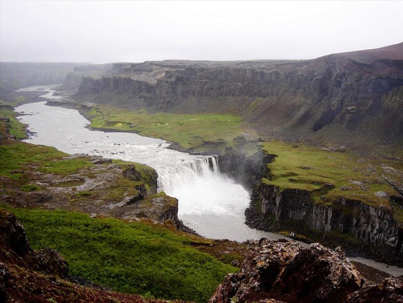 near the Aðaldalur area. The waterfall cascades into a deep and narrow canyon,