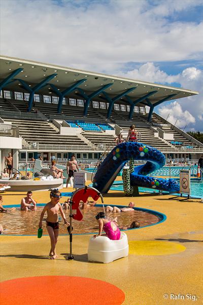 The facilities are extensive and include indoor and outdoor pools, hot tubs, steam baths, a cold pool, and water slides. The lively environment caters to all age groups, whether visitors are seeking exercise, relaxation, or social interaction.