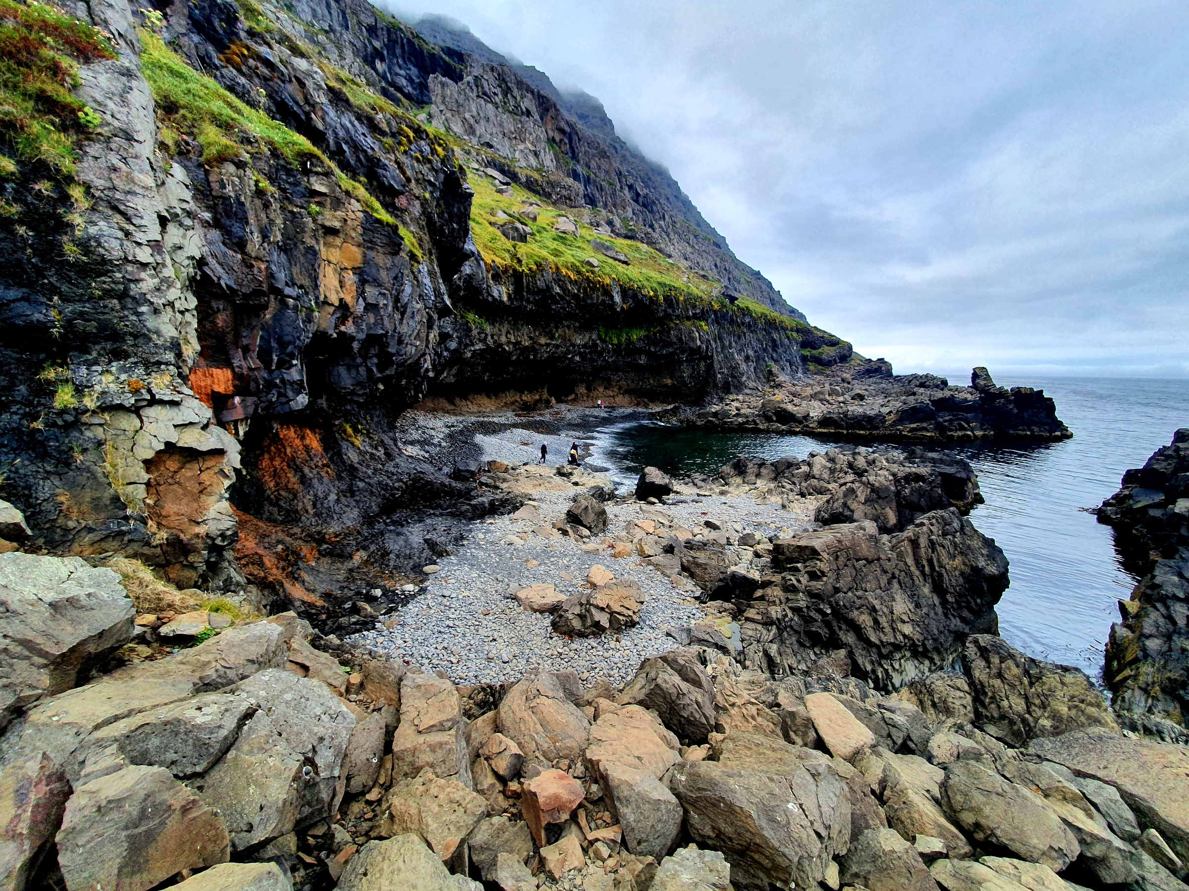 Þar er stigi niður í grýtta fjöruna og þaðan er hægt að ganga inn í hellinn sjálfan.