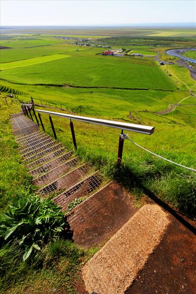 A staircase beside the waterfall leads to the top, offering spectacular views over Skógárgil, where the river forms numerous smaller waterfalls on its journey from the highlands. Just above Skógafoss begins the popular hiking route across Fimmvörðuháls, connecting Skógar with Þórsmörk.