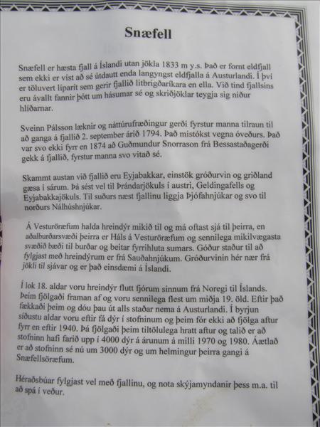Snæfell er hæsta fjall á Íslandi utan jökla 1833m. Það er forn eldfjall sem ekki er víst að sé útdautt enda langyngst eldfjalla á Austurlandi. Í því er töluvert líparít sem gerir fjallið litbrigðaríkara en ella. Við tind tjallsins eru ávallt fannir þótt um hásumar sé og skriðjöklar teygja sig niður hlíðarnar.