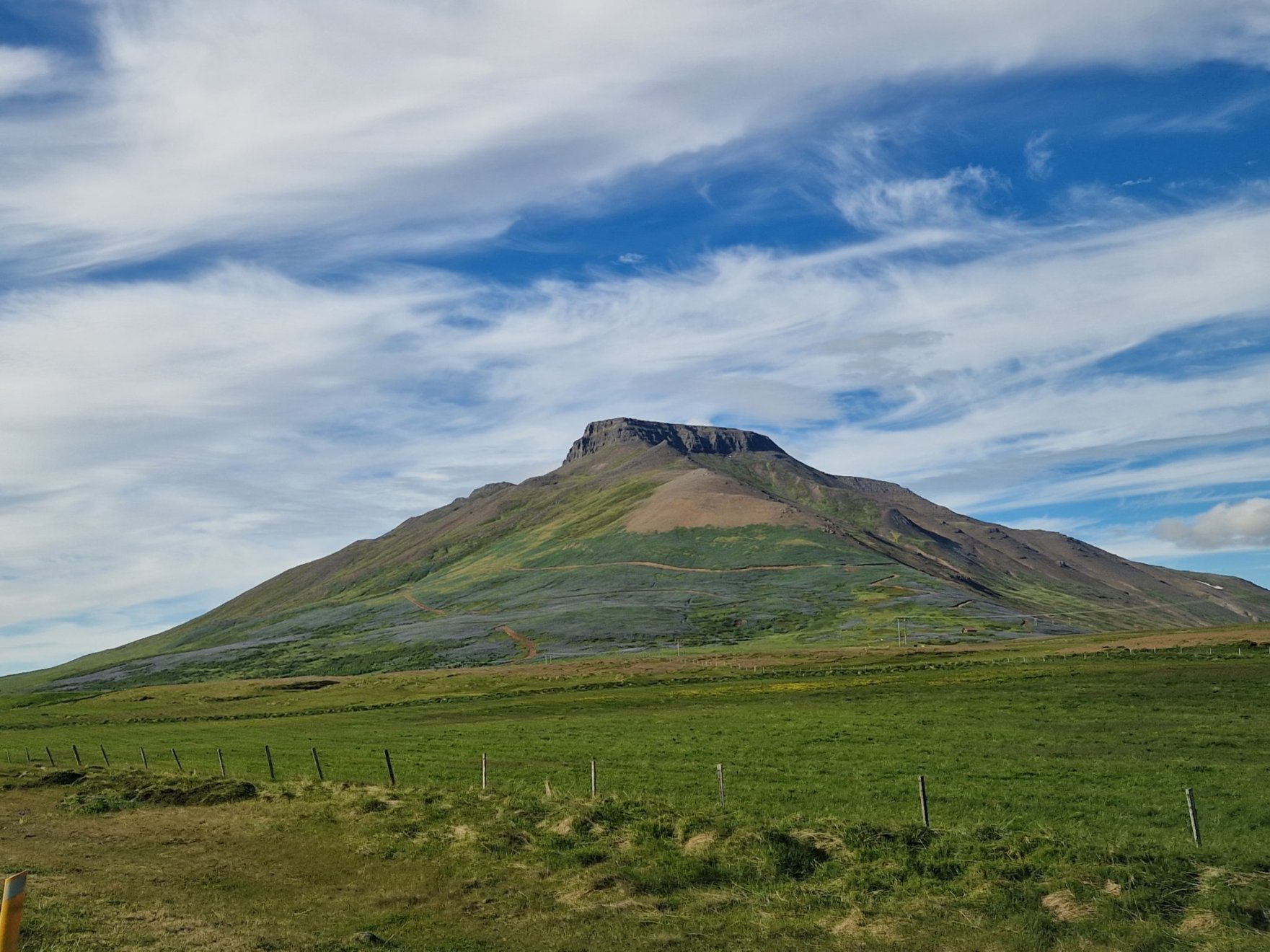 Spákonufell is a prominent mountain in northern Iceland, located near the town of Skagaströnd. The mountain rises distinctly from its surroundings and is easily recognizable due to its symmetrical shape and striking profile.