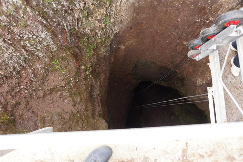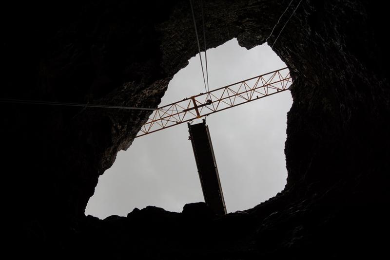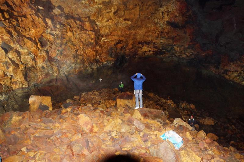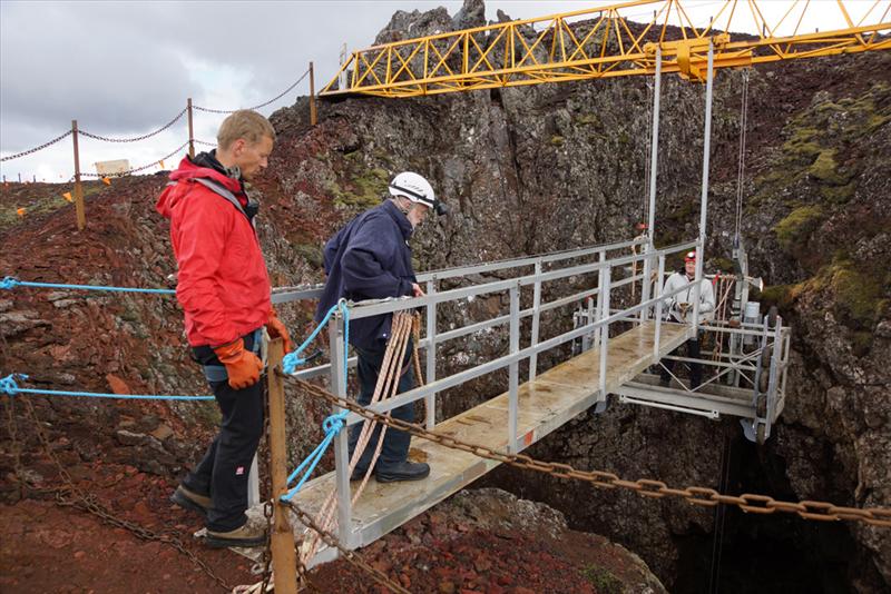 Þríhnúkagígur (Icelandic pronunciation: [ˈθr̥iːˈn̥uːkaˈciːɣʏr̥], anglicized as Thrihnukagigur, literally translated as Three Peaks Crater) is a dormant volcano near Reykjavík, Iceland.[1] Covering a 3,270 square metres (35,200 sq ft) area and a depth of 213 meters (699 ft), it has not erupted since the second century BC. It was discovered in 1974 by cave explorer Árni B Stefánsson, and opened for tourism in 2012. It is the only volcano in the world where visitors can take an elevator into the magma chamber. The magma that would normally fill the chamber and become sealed is believed to have drained away, revealing the rift beneath the surface.